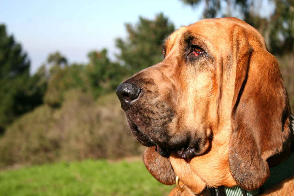 | Глаза | Среднего размера, овальные, темно-коричневые или ореховые. Веки плотно прилегают, но могут быть видны красные слизистые оболочки. Выражение глаз спокойное, задумчивое. | [Фото крупным планом головы Бладхаунда] |