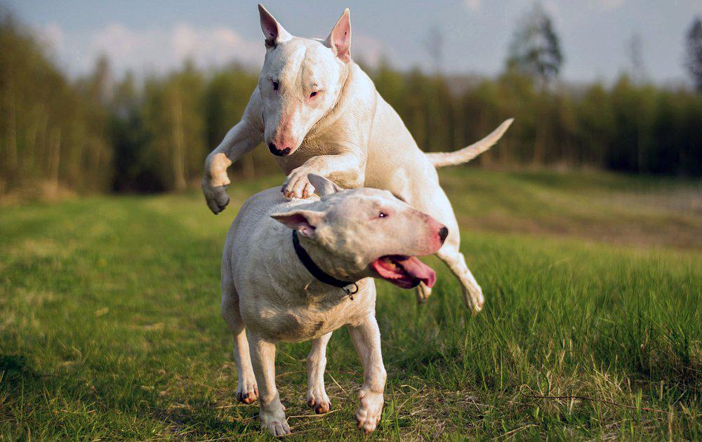 Бультерьеры могут проявлять агрессию к собакам своего пола, но только при возникновении опасности со стороны собрата. Задача владельцев – предотвратить конфликт, что возможно при правильном воспитании животных. Они игривы, однако могут не рассчитать силу хватки. Если им скучно, могут искать приключения, чтобы доказать, что они самые сильные и умные.