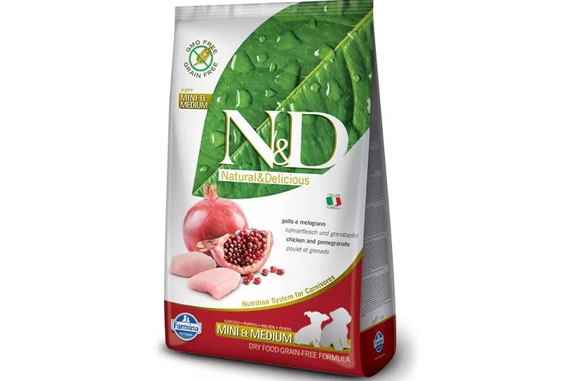 Компания «Farmina» выпускает несколько различных продуктов для собачьего питания. Например, «Chicken Pomegranate Mini Medium Puppy» одинаково подходит как щенкам 4–5 месяцев, так и пожилым собакам. Продукт содержит натуральный животный белок, 50% мяса, ягоды, фрукты, овощи, витамины и травы. Такой состав улучшает пищеварение и борется с ожирением.