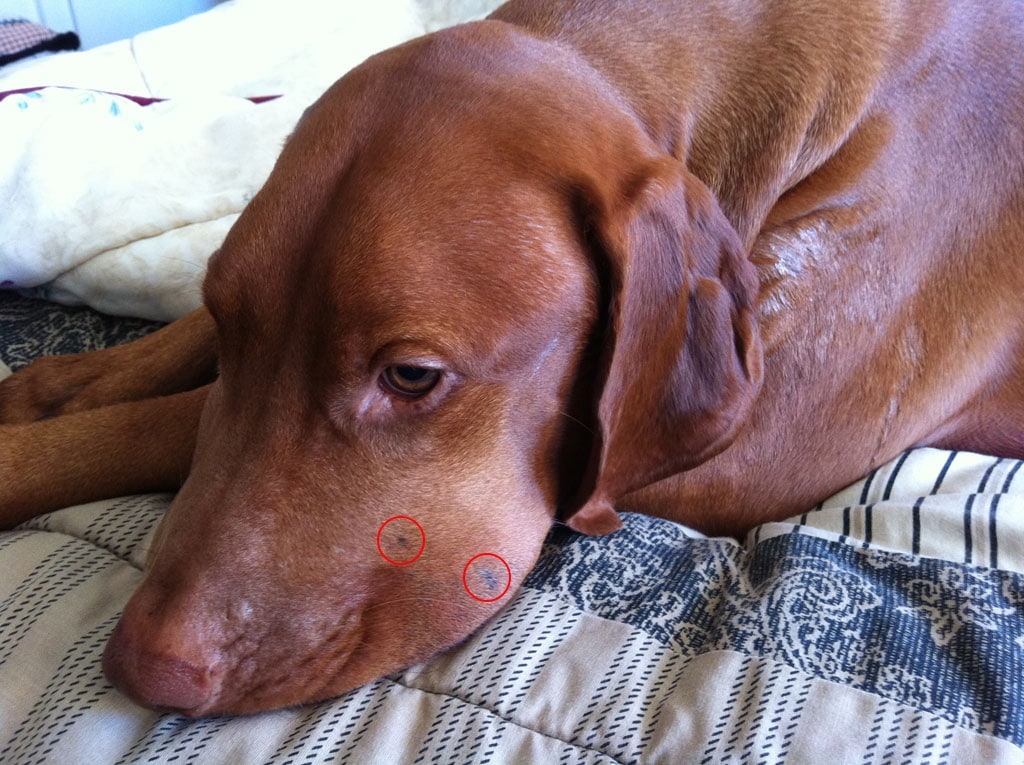 - На месте укуса образуется отек. Ткани начинают опухать, и на поверхности можно заметить две красные точки – следы от зубов. Из ранок может выделяться кровь и сукровица. При попытке прикоснуться к поврежденной области животное уклоняется и издает звуки.