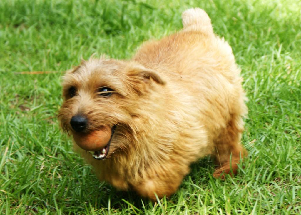 Передние лапы прямые и короткие, задние – более мускулистые. Конечности имеют округлую форму. Шерсть прямая, на ощупь жесткая. На шее и плечах она более длинная и грубая, на голове и ушах – короткая и гладкая. При описании цвета шерсти используется упоминание таких оттенков, как рыжий, палевый, чепрачный, серый. В редких случаях у норфолк-терьеров бывают белые пятна.
