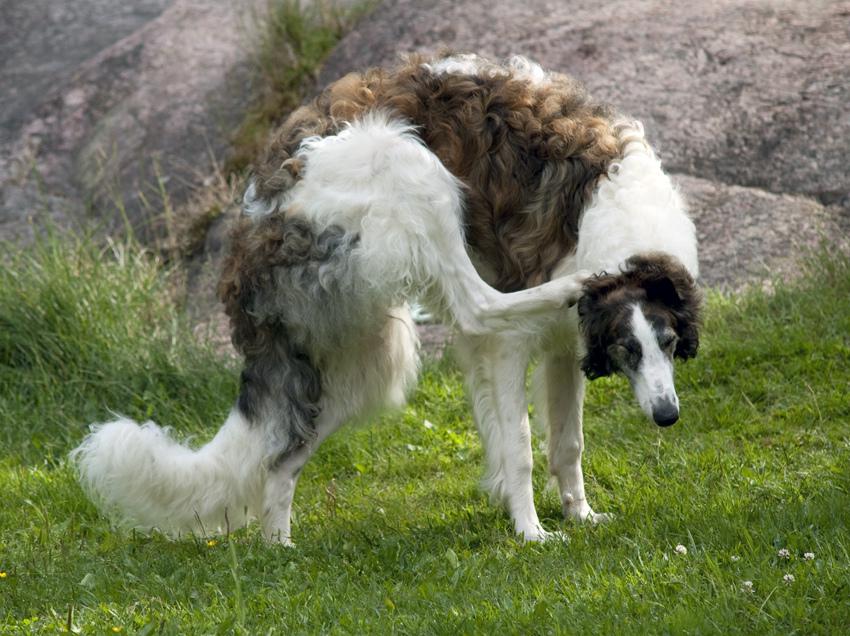 Шерстный покров на туловище гораздо длиннее, волнистый. На плечах и крупе шерсть образует выраженные завитки. На боковых областях и бедрах она короче. У представителей этой породы собак имеются очесы, штаны и подвес на хвосте, при этом псовина на шее у борзых очень богатая.