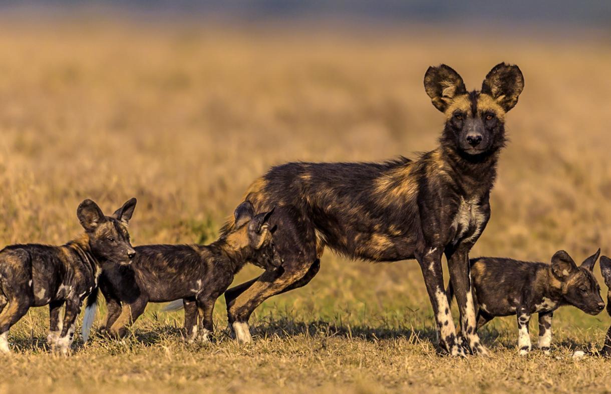 Происхождение и внешний вид: Гиеновидные собаки (Lycaon pictus) не являются настоящими собаками, а представляют собой отдельный вид, относящийся к семейству псовых. Они отличаются ярким окрасом с пятнами, что помогает им маскироваться в саванне. Их тело более стройное и длинное по сравнению с обычными собаками, а уши большие и стоячие, что придает им характерный вид.