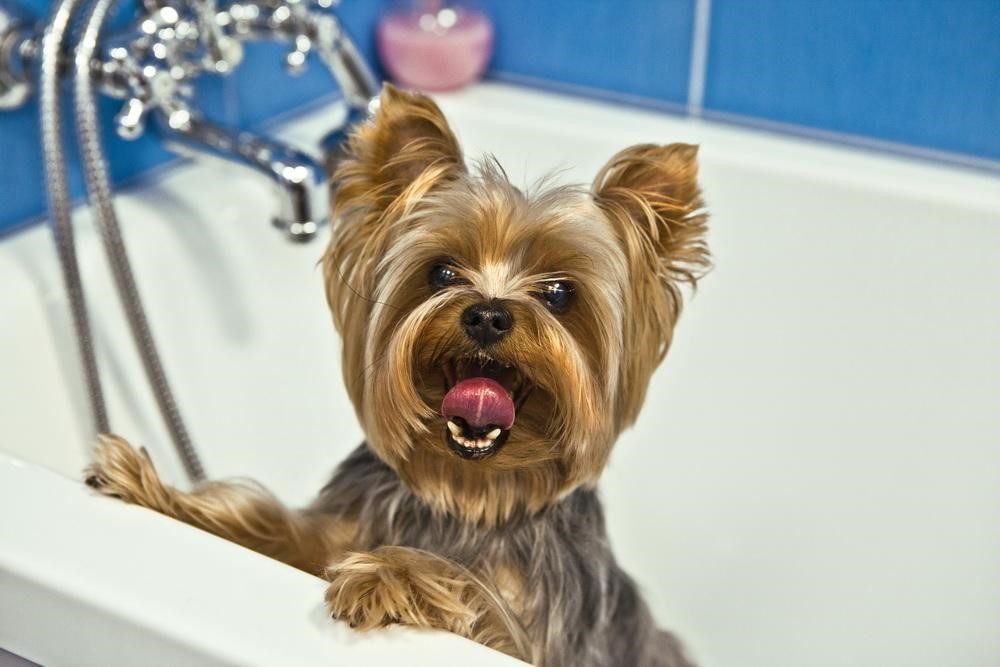 Перед грумингом собак моют. Купать ли миниатюрного терьера после стрижки, решает хозяин. Если питомец испытывает сильный дискомфорт, нервничает, его тело чешется из-за мелких состриженных волосков, которые раздражают кожу, то лучше искупать подстриженного песика. Чаще всего эта потребность возникает, если в процессе работы применялась машинка. Чтобы искупать питомца, потребуется специальный шампунь и кондиционер.