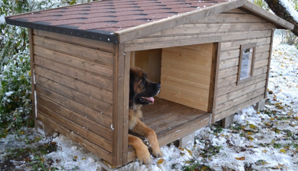 Домик с навесом не способен обеспечить жильцу хорошей защиты от ветра и холода, поэтому его устанавливают в месте, где не дует: за какой-нибудь хозяйственной постройкой, за жилищем людей, высоким забором. Крышу и днище конуры со стороны лаза делают выступающими.