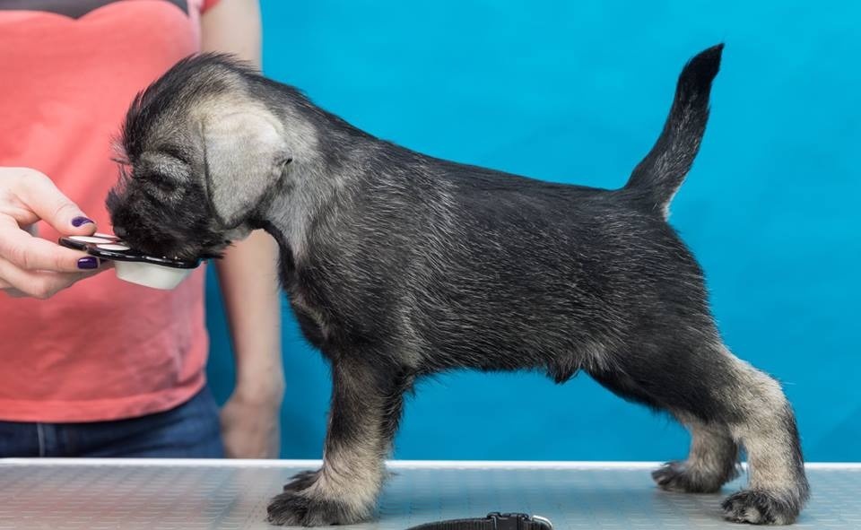 Иногда шнауцеру можно давать куриные или перепелиные яйца и немного черного хлеба. В поилке должна быть чистая вода комнатной температуры. Нельзя давать питомцу соленые, жареные, копченые, сладкие блюда, а также мучные изделия и картофель. Такое питание негативно сказывается на работе ЖКТ пса. Кормить взрослое животное нужно 2 раза в день. Маленьких собачек следует кормить с учетом возрастных особенностей. Щенки до 2-х месяцев питаются 6 раз в сутки, к полугоду их переводят на 3–4-разовое питание, а к годовалому возрасту – на взрослый режим.
