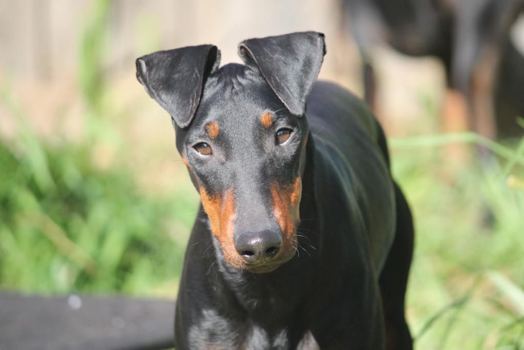 Уши треугольные, расположены высоко. У некоторых особей они стоят, как на фото, у других – висят, образуя форму бутона. В некоторых странах висячие уши подвергаются купированию.