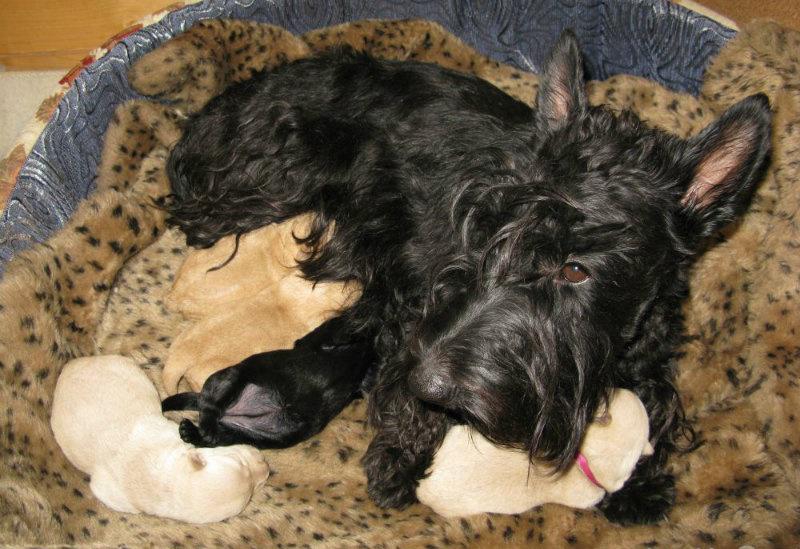 Поскольку щенки скотча достаточно крупные, а собака имеет небольшой размер, роды могут протекать с осложнениями. Часто сукам требуется кесарево сечение, поэтому хозяева должны быть готовы к этому заранее. Один помет приносит до 8 щенков.