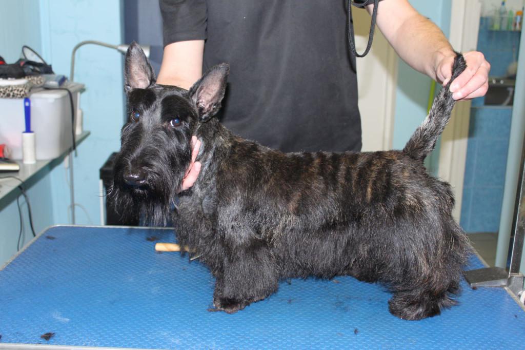 Традиционную стрижку скотти заменяют триммингом и проводят дважды в год в период линьки. Эта процедура помогает телу питомца свободно дышать под жестким волосом и, в отличие от стрижки машинкой, не нарушает структуру шерсти. Перед выставкой тримминг лучше доверить специалисту и выполнить заранее, примерно за 2 недели до назначенной даты.
