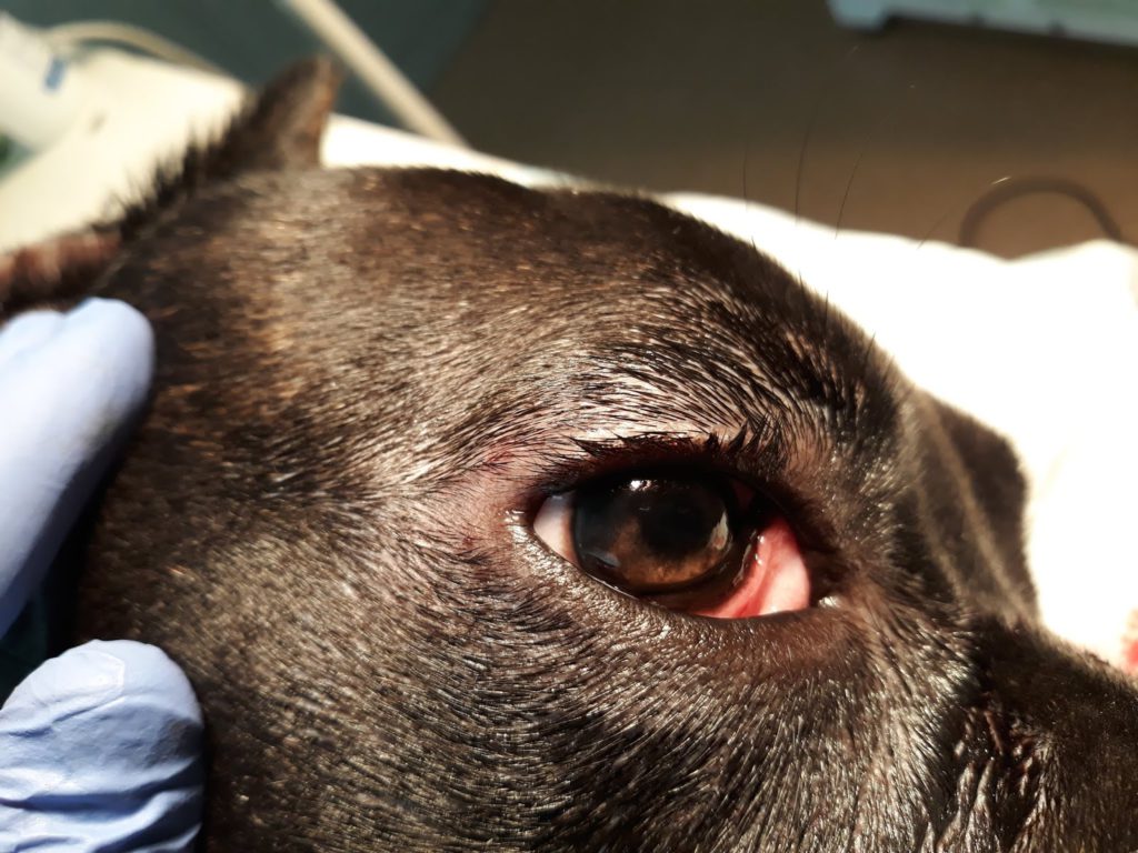 - сильным зудом и болью, которые пес пытается унять, потирая глаз лапой;