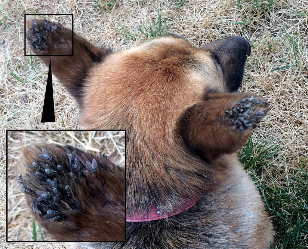 Наибольшую угрозу представляют мухи-жигалки. Этот вид насекомых активен в период с августа по сентябрь. Жигалки могут кусать собак в различных частях тела. В некоторых случаях мухи откладывают личинки в области основания хвоста крупных животных, где образуется складка, затрудняющая собаке избавление от личинок. Если не заметить опарышей вовремя, они могут нанести серьезный вред, поедая ткани кожи и мышц питомца.