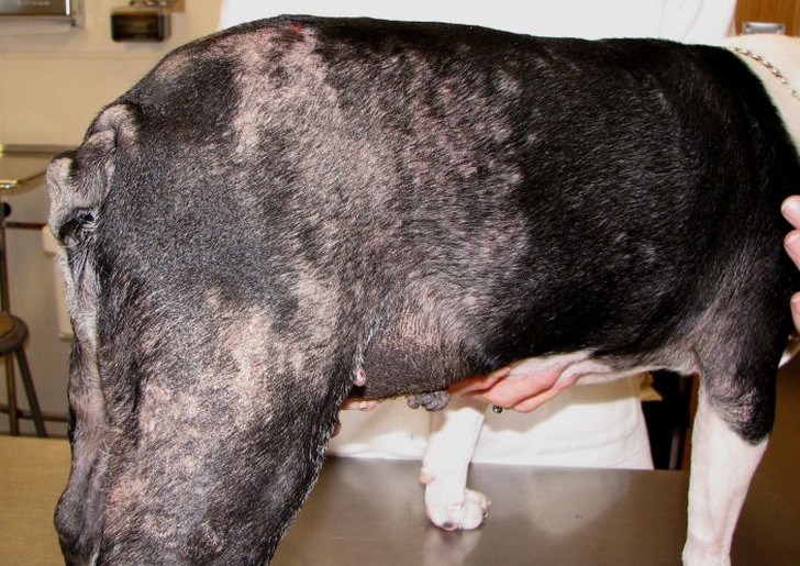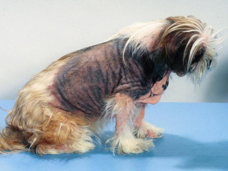 | Гиперэстрогенизм | Причина заболевания — повышенное количество эстрогенов в организме животного. | Облысение кожи, окружающей половые органы, увеличение вульвы у сук и опухание полового члена у кобелей. |