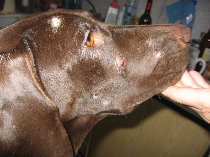 По мере развития демодекоза у основания волосяного покрова появляются красные пятна. Со временем возникают пузырьки с красновато-глинистым содержимым. На месте лопнувших пузырей образуется плешь. Эта болезнь может развиваться и по иному сценарию. На пораженных участках появляются сухие чешуйки, склеивающие шерсть. Через определенное время они отпадают, а под ними на коже выделяется гнойный экссудат. Помимо этого, патология сопровождается апатией питомца, отказом от пищи, понижением температуры тела, ослаблением иммунитета.