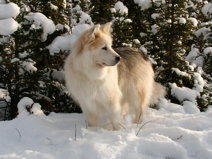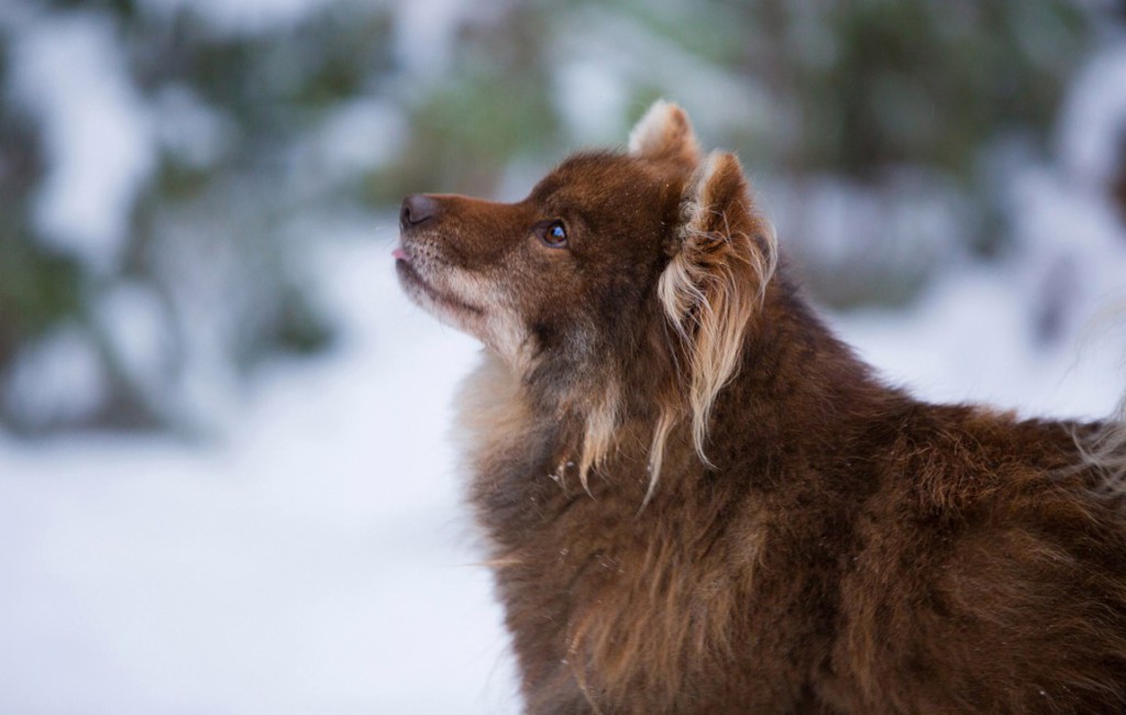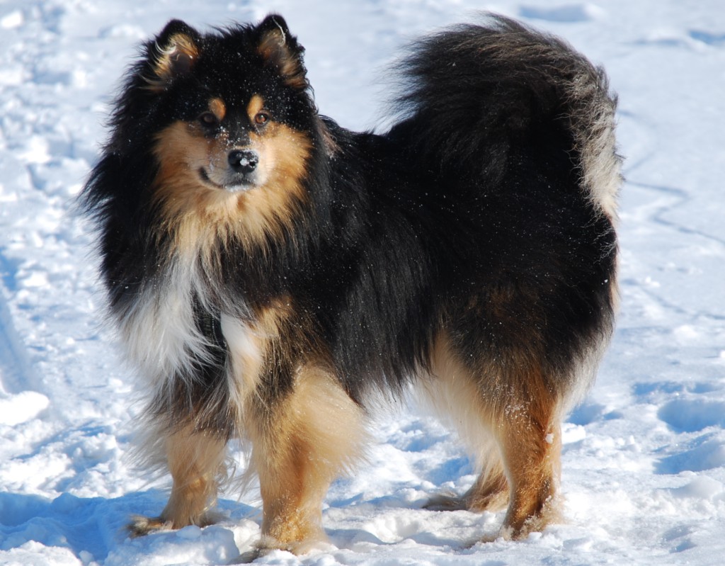- Шерсть. Выполняет функции защиты от мошек и гнуса, а также позволяет животному переносить экстремальные температуры (морозы до минус 50ºС и жару). Оленегонный шпиц обладает прямым и жестким остевым волосом, а также мягким подшерстком. В области ушных раковин наблюдается хороший защитный покров. Длина украшающих волос на хвосте нередко достигает 25 см. На морде выражены баки, на теле – штаны и воротник. Длина шерстного покрова не должна быть меньше 8 см. У одной из разновидностей породы (яндо) украшающий волос отсутствует, а шерсть является укороченной.